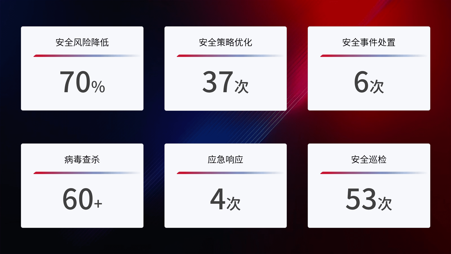 提供全面的安全事件报告体系,,,,包括处置报告、、、周报、、季度和年度总结,,结合持续监控,,,帮助客户深入了解网络安全状况。。