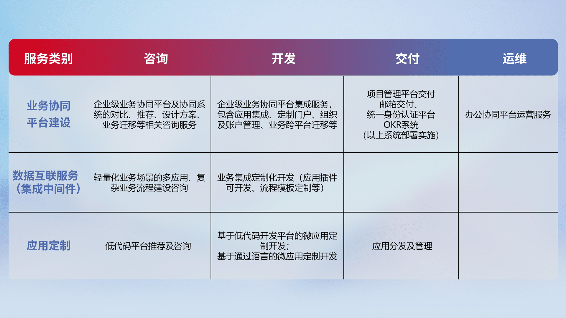 针对钉钉、、企微、、、、IDaas等平台级产品提供产品的规划、、、方案、、交付、、、、定制化开发等服务,,,实现如统一协同办公、、、、智能客户服务、、、、混合会议管理、、智能数据查询、、、、等业务场景,,实现数字化转型。。