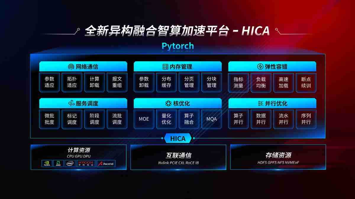 通过自研的服务层、、中间适配层、、、以及调度编排算法,,采用数据并行、、、模型并行等多种并行方式,,,,把并行计算任务进行有效的分解,,,,使其分别由相应的软件栈和算力资源来承接。。。。当GPU资源变化,,,HICA可以实时动态调度计算子任务并调整模型拓扑和架构,,,以充分聚合各种算力资源。。